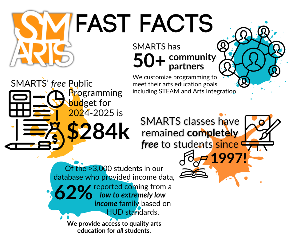 SMARTS, Students Motivated by the Arts, is celebrating our 28th year in the community as a leader in arts education. Since the pandemic, we have experienced continued growth in our free Public Programming offered at SMARTS and throughout the region in our Community Programming with our partner schools and youth organizations. New students apply daily for our free classes and we continue to add new teachers and offerings in visual arts, music, dance, theater, and creative writing for PK-12 students.